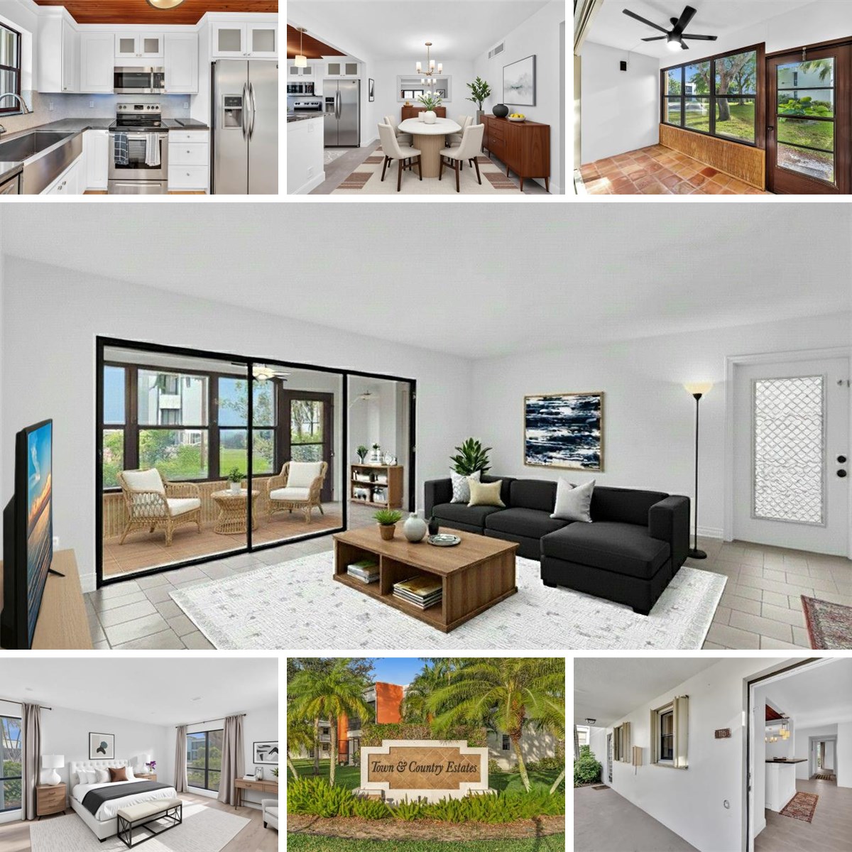 Step into a bright, white kitchen featuring granite countertops, stainless steel appliances, and a breakfast bar that flows seamlessly into the dining area. The open-concept living room leads to an all-weather patio, ideal for morning coffee or evening cocktails.